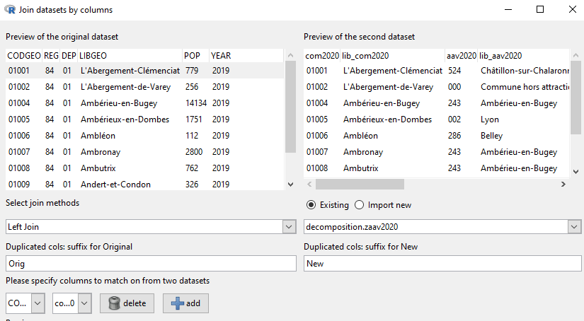 Je vais joindre mes données communales en format long et cette table de passage, il suffit de préciser les colonnes de jointure, CODGEO à gauche, com2020 à droite :