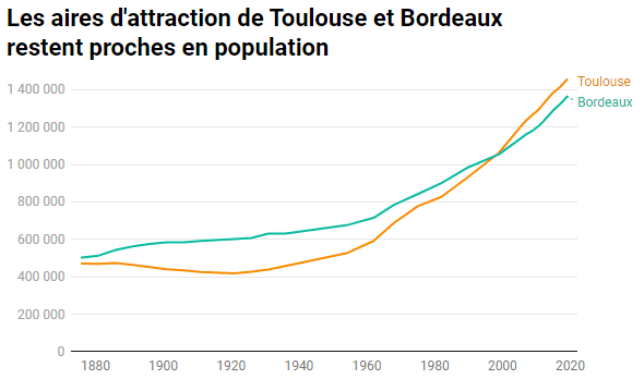 Puis filtrer sur les AAV de Toulouse et Bordeaux (codes 005 et 006), et l’on arrive très vite à ce dernier graphique, un peu moins vexant pour les Bordelais – nous-autres Toulousains, on aime bien les taquiner :