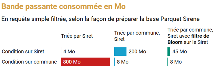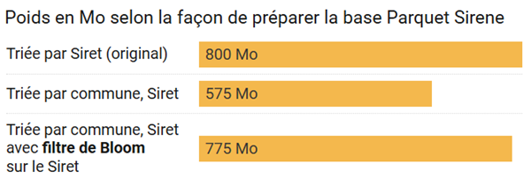 Le lecteur et la lectrice perspicaces, surtout si Sirene leur est familier, auront déjà pensé : mais quel intérêt, une base Sirene est déjà triée par Siret ! Les stats min-max de chaque row group permettront d’éliminer tous les row groups sauf le bon. Un filtre de Bloom n’apportera rien de plus.