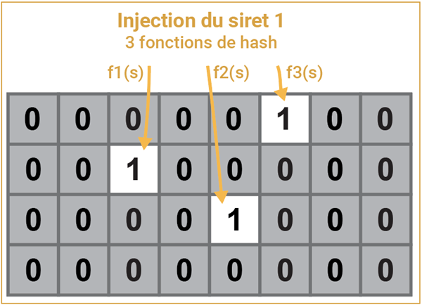 Trois fonctions de hachage indépendantes réduisent donc le siret considéré à une signature simplifiée de trois entiers, trois bits qui basculent à 1 dans le filtre. Cette réduction fait que la signature d’un siret n’est pas forcément unique. Deux sirets pourraient laisser la même signature, même si c’est rare. En revanche, cas de figure plus fréquent, deux signatures pourront avoir un ou deux bits en commun.