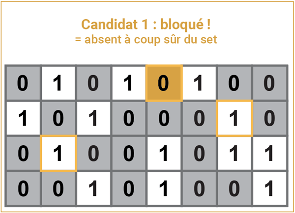 Je constate que la signature de ce candidat tape dans un bit bloqué à 0 : je sais alors avec certitude que ce siret 40759029800011 n’est pas dans ce row group. Ma requête peut donc totalement l’ignorer.
