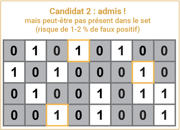 En revanche, il pourra aussi répondre : « oui, peut-être que cette valeur est présente ». Mais son grand intérêt est qu’il se trompe peu (typiquement 1 à 2 % de « faux positifs ») et qu’il est très rapide à consulter. Il permet ainsi d’éviter de coûteuses recherches.